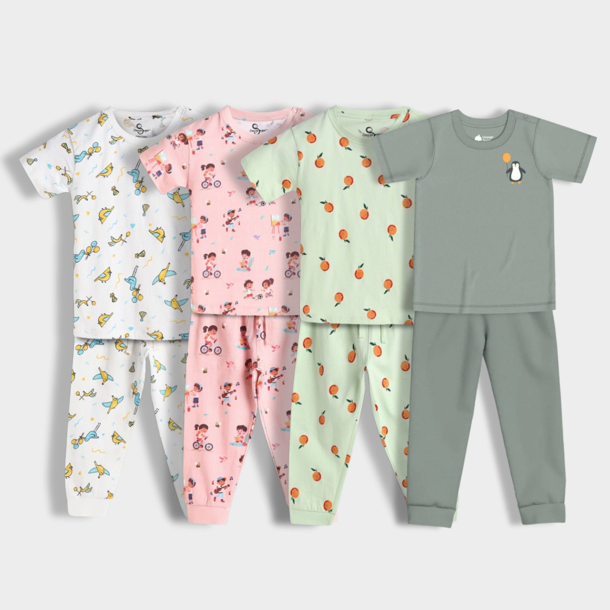 4 Pack Half Sleeves Unisex Co-ord Set | Orange Bliss, Garden, Bird & Penguin Float